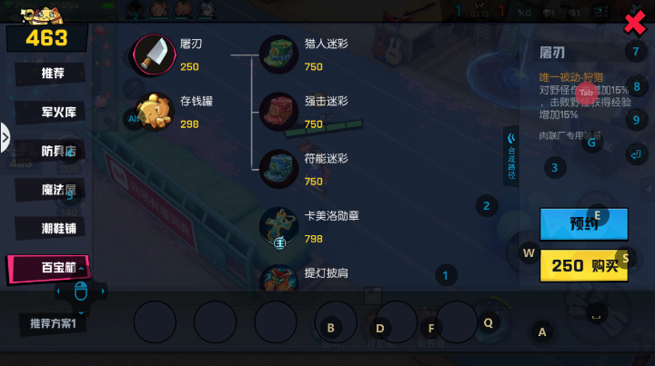 在游戏刚开局时,我们需要在商店当中购买屠刃,该装备能够提升我们对野怪的伤害,因为刚刚开始玩,所以后续的出装我们直接跟着系统所给的出就好。