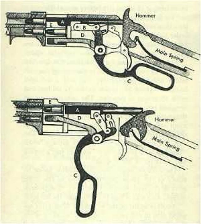 这样的设计使得M1887在向下甩出的过程中保持退膛杆及其握环不动,也就完成了退膛过程。当然,甩一圈基本就是为了耍帅而已。