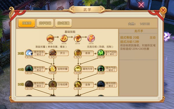 五大门派当中,每个门派均有4个基础技能,当角色达到一定等级,即可以学习对应技能,而每个门派共分有2条不组不同的技能树,不同技能树有不同的职业定位倾向,玩家可以根据自身需要进行选择。想要学习下一等级技能,需要学习前一个等级技能才能开始哟。