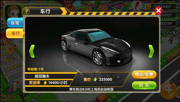 车辆购买需要去【车行】,不过也不是什么车都能买的哦,高等级的豪车需要餐厅/VIP达到相应的等级才能购买,每种豪车有7天和30天两种选择,玩家可以在有效期内把车停放在停车位以赚取金币和钻石。